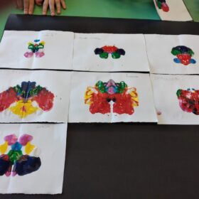 Possiamo fornire carta e colori agli alunni per consentirgli di realizzare le cosiddette macchie simmetriche. Attraverso l’utilizzo delle macchie simmetriche realizzate con il colore, i bambini possono creare delle bellissime composizioni cromatiche in grado di suscitare il loro interesse; infatti tali macchie, possono rappresentare anche uno spunto utile per fare delle osservazioni relative al colore e alle simmetrie. Per realizzarle, occorre innanzitutto piegare il foglio a metà, dopodiché si versano poche gocce di colore sul foglio e si piega a metà. Si continua premendo con forza, per riuscire a sovrapporre bene le due parti. A questo punto il foglio va aperto, così da far apparire un bel disegno simmetrico sulle due facce. Si potrà poi continuare il gioco, facendo immaginare ai bambini quale possa essere la figura che appare, utilizzando la fantasia nelle macchie colorate. Per evitare di sprecare della carta di qualità, vale la pena riciclare quella di giornale, che si rivela ottima per fare questo tipo di esperienza oltre che essere poco costosa.